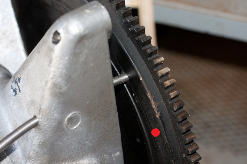 Alors, sur les 2 CV type A pour lesquelles il n'y a pas de trou dans le volant moteur ni dans le carter, Citroën a prévu néanmoins une disposition : il y a un repère au burin sur le volant, il faut aligner ce repère avec le plan d'assemblage des demis carters.