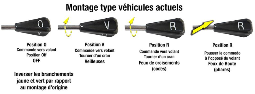 Il semble exister un montage modifié, et qui est plus similaire de nos voitures actuelles fait que si on tourne le comodo on suit la séquence OFF -> veilleuses -> croisement :