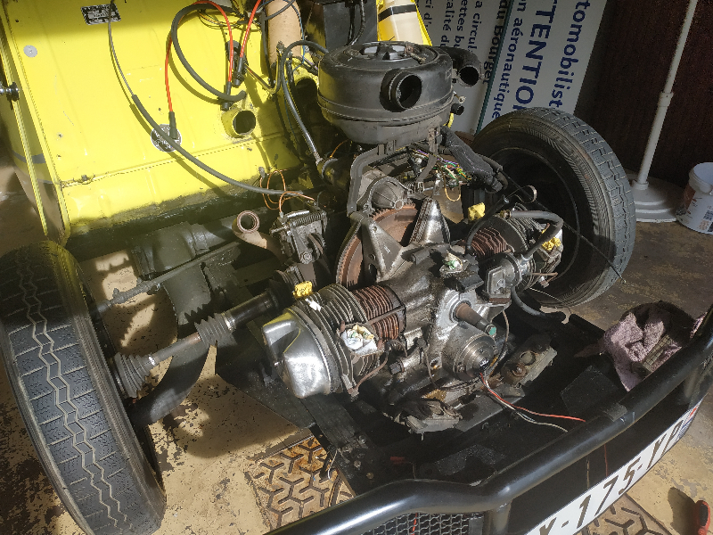 Le carénage de ta voiture, celui peint en bleu, n'est pas un modèle pour 2 CV, mais pour Dyane ou AMI 8 avec la prise de la soufflante, qui, comme le dit René, a été supprimée.