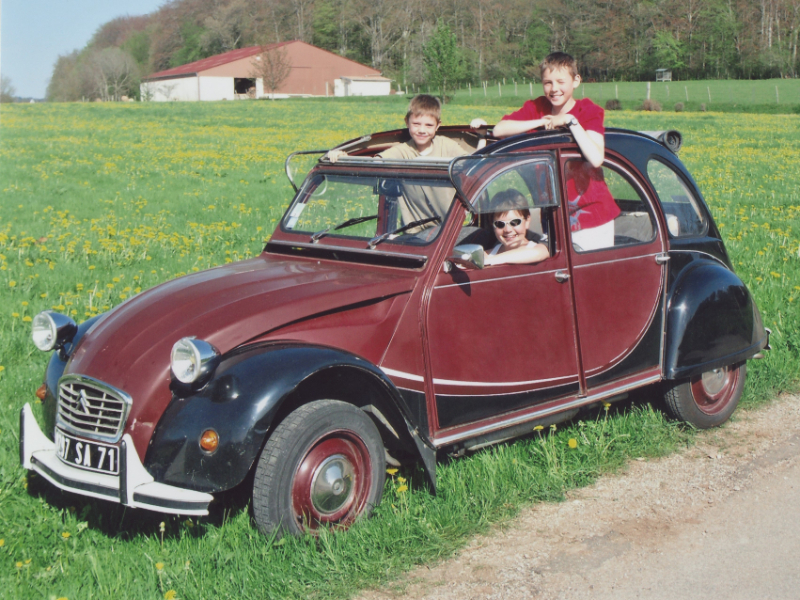rien de bien original : mes premières sorties, et vacances, c’était en 2cv, mais aussi en dyane, ou ami 6 ou 8, plus rarement en visa chrono…. Faut dire que c’était facile puisque je suis né au fond d’un garage citroen. Avec mes cousins, pour faire une virée, il suffisait de prendre la voiture … qui avait de l’essence. Y en a qu’on eu de la chance !