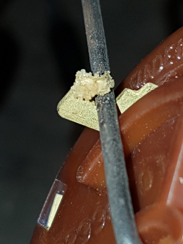 Pour le linguet, j'ai trouvé une lamelle de contact en cuivre, que j'ai soudée à l'étain puis découpée pour réparer le contact.