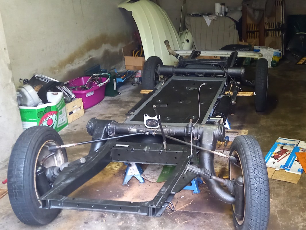 Actuellement j'ai pratiquement remonté le châssis, c'est à dire, train AV et AR, réservoir, tuyaux d'essence et de freins (jusqu'à l'avant), levier du frein à main, pot de suspension.