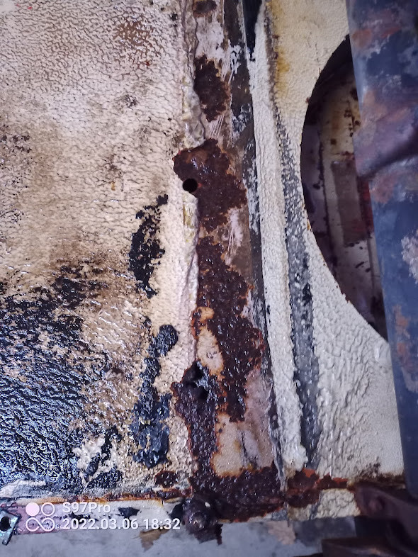 Pour le plancher du châssis :???: son aspect ne m'inspire pas trop confiance...à ta place j'agrandirais les trous existants, en supprimant toute la tôle rongée en surface pour voir un peu comment est l'intérieur et à tout le moins pour traiter la partie avant du châssis fréquemment rouillée à cet endroit...