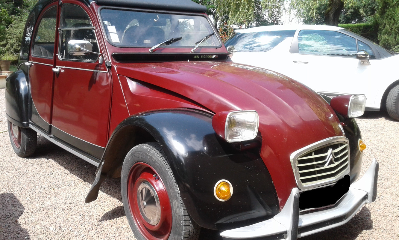 La belle est a la base une 2CV6 classique, mais a été repeinte en charleston rouge/noir.