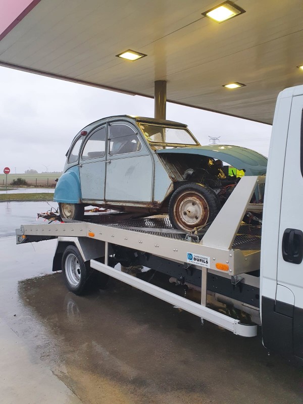 une épave à 1300 euros que je ramène de très loin, aujourdhui elle tourne , elle roule heuuu enfin dans ma cour en première et en marche arr , partie chassis refaite nickel par mes soins et les travaux continuent .