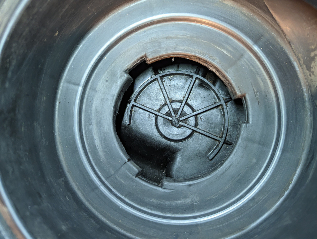 Voilà le filtre correctement fixé, sans que le collier ne soit serré comme un sac : Je vais avoir ça à réparer : Le trou s'est formé suite à une abrasion avec la jupe en caoutchouc fixée sur l'aile.