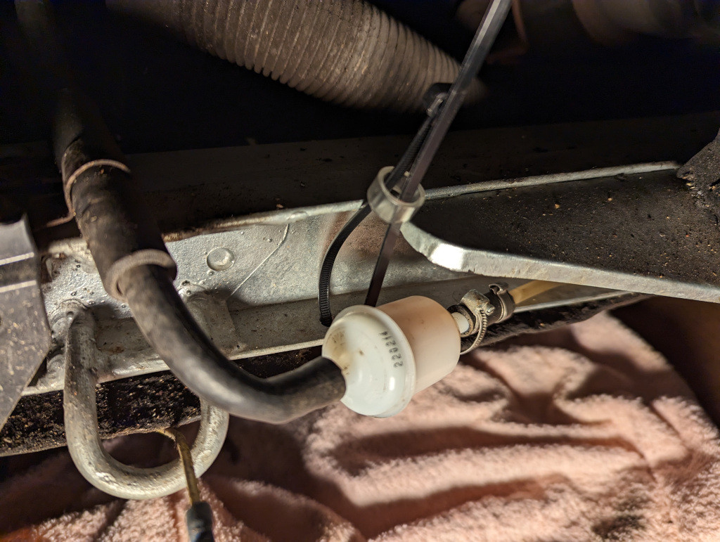 Puis j'ai inséré le nouveau filtre dans le tuyau côté réservoir. L'essence a commencé à remplir le nouveau filtre.