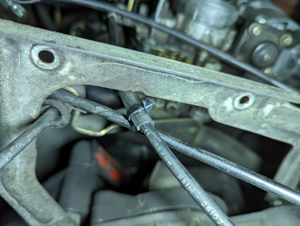 J'ai raclé ce qui a bien voulu se laisser attraper, et j'ai aussi utilisé du dégraissant que j'ai proprement retiré avec la crasse qu'il a pu détacher. Avant de remonter la boîte nettoyée, j'observe un combat entre la gaine du câble du starter et le support de la boîte : Un bout de 5 cm de tuyau souple est coupé sur sa longueur, inséré sur la gaîne et immobilisé avec des colliers.