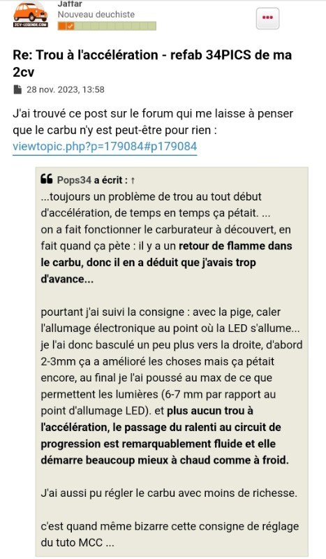 Je rencontre des problèmes avec ma Méhari d'un trou à l'accélération, ayant revu le carburateur en long en large et en travers (viewtopic.php?t=18606) j'en viens à me demander s'il ne s'agit pas d'un souci lié à mon allumage électronique (MCC) :pense: