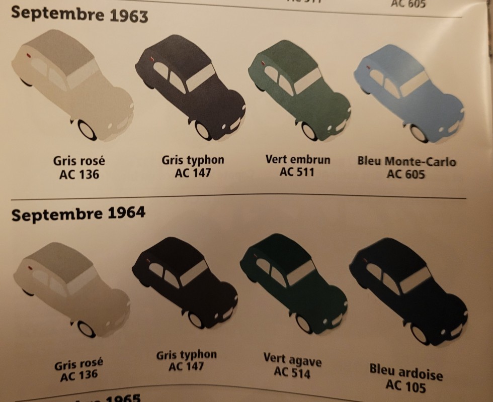 Soit Ac136 soit gris rosé Comme ta voiture est de 1964, cela est confirmé par le fascicule de 2cvXpert Donc, cette joli 2cv était grise à sa sortie d'usine (comme celle de mon grand-père, que des souvenirs
