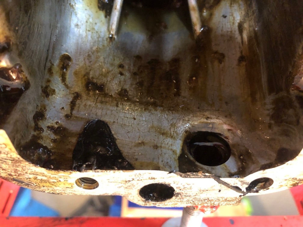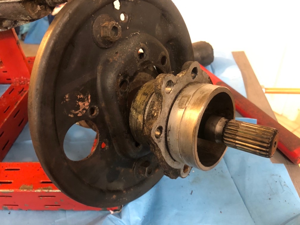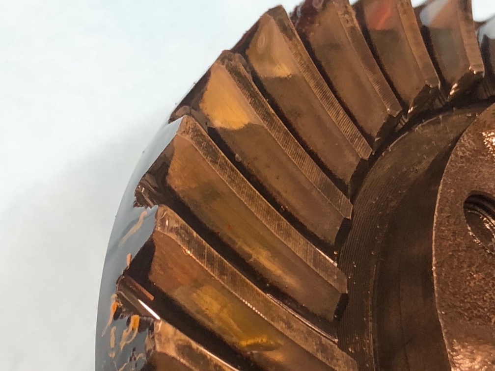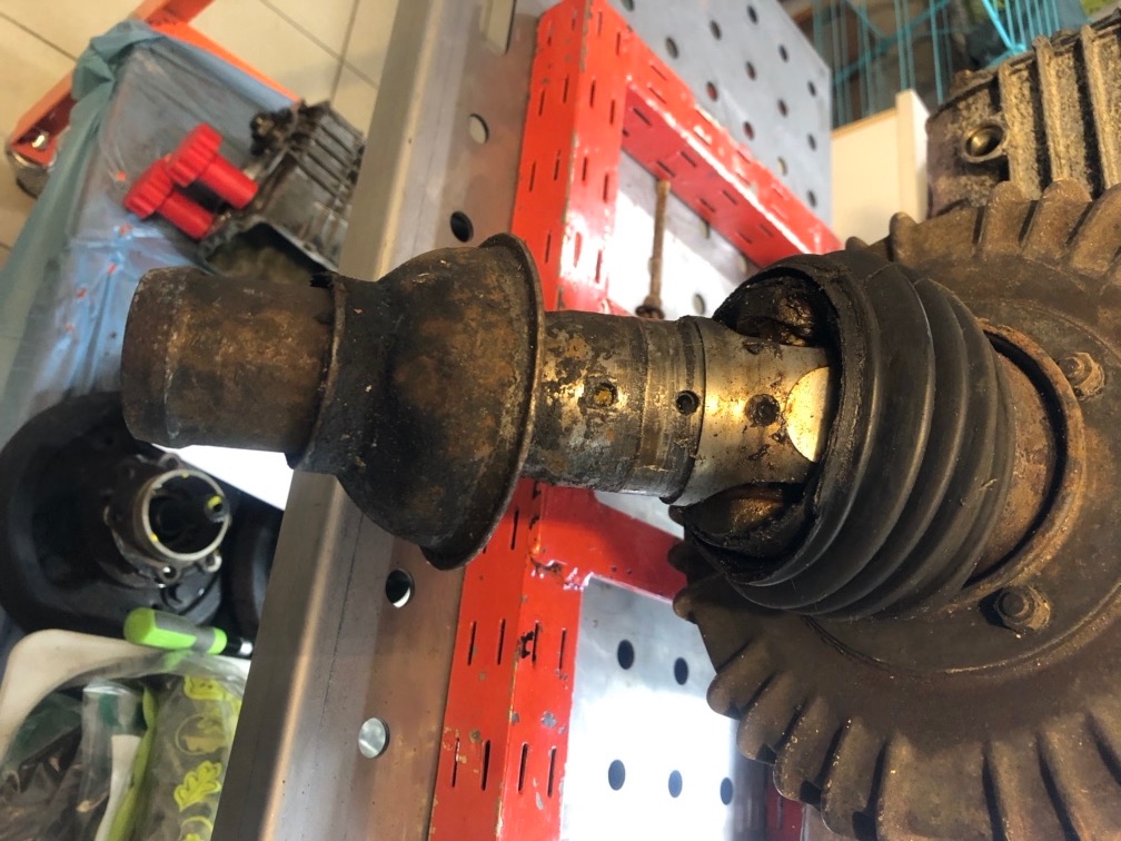 Et voilà ce qui "reste" coté carter de BV : à droite, l'arbre de commande et à gauche le pignon conique, avec sa denture hélicoïdale.