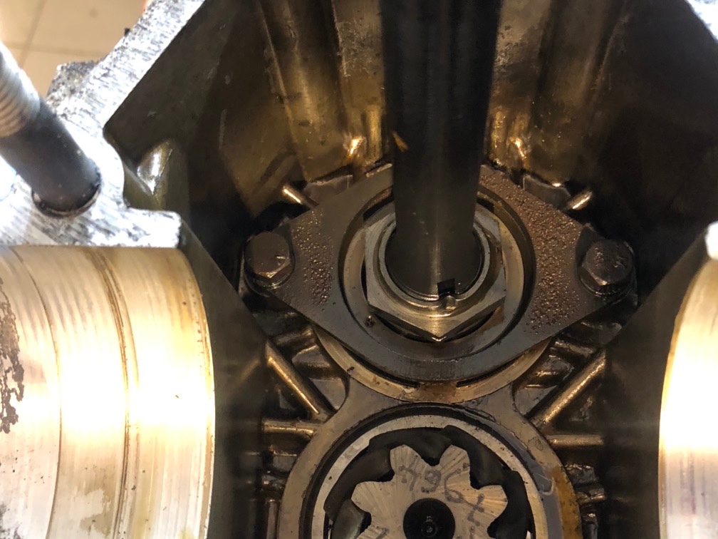 Comme le pignon d'arbre de commande est à taille oblique, il subit une poussée axiale lors de sa rotation, poussée qui est contenue par une brise :