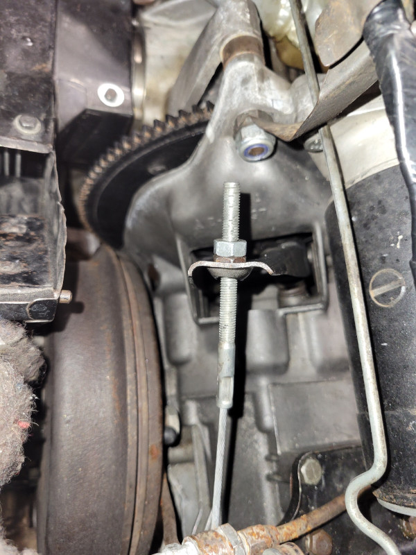 Voici quelques photos, la position des écrous de réglage du câble d'embrayage me parait suspecte, pouvez-vous me donner votre avis ? J'ai l'impression qu'ils ont partiellement traversé la fourchette, il n'y a pas une rondelle à cet endroit en théorie ?