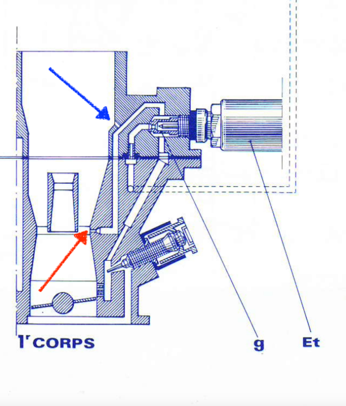 Car tu y retrouves la prise d'air pour le circuit de ralenti (flèche bleue) et comme nous sommes sur un carburateur monojet, le trou de non-renversement ! (flèche rouge) !