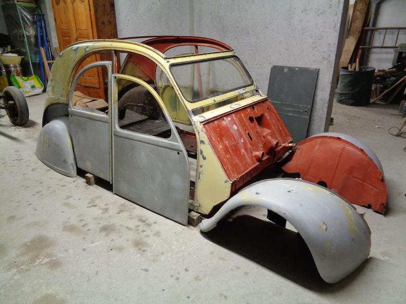 Photos de la 2cv après les 3 couches de peinture noire antirouille: