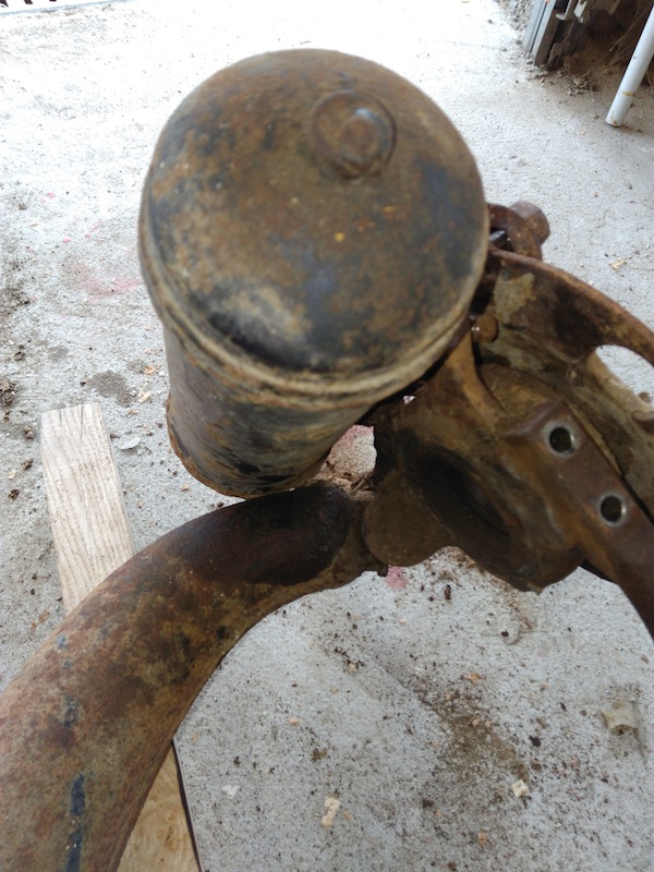 En revanche, le batteur avant gauche est soudé :shock: alors que l'autre côté j'ai pu l'enlever. Ce n'est pas une petite soudure de rafistolage, c'est un super beau cordon très réussi. Il y a sûrement eu un choc à cet endroit (en lien avec pli du châssis peut être) ceci explique cela. Par contre les 2 leviers de direction avec la rotule sont boulonnés et soudés au pivot (???