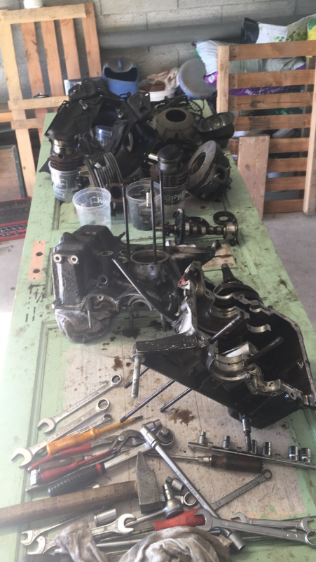 Bonjour à tous, Ca y est, ma belle est remontée...Pour refaire l'historique, je n'ai pas vu que le moteur n'avait plus huile et ce qui devait arriver arriva...adieu la bielle! Ayant la chance d'avoir dans mes proches un mécano disponible, j'ai décidé de faire les réparations suivantes: -vilebrequin ...