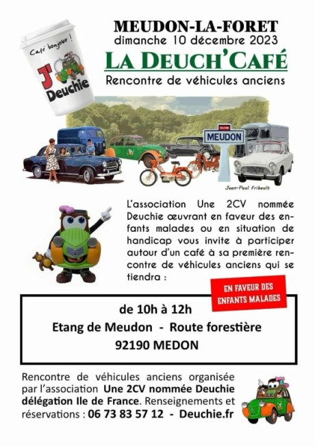 Bonjour à tous L'association "une 2cv dans les nuages" qui organise des évènements solidaires en faveur d'enfants en situation de handicap a le plaisir de vous convier au 3 ème Deuch' café. Rendez vous le dimanche 8 décembre de 10h à 12h à Meudon-La-Forêt pour notre troisième : " Deu...