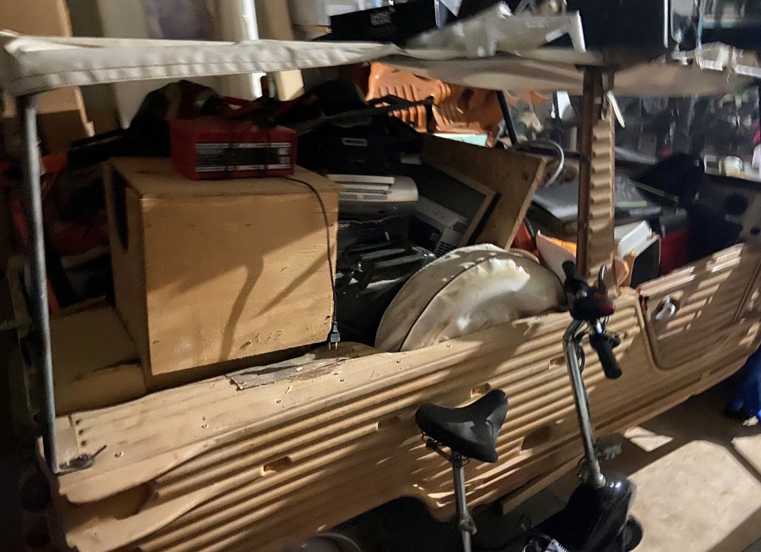 Mehari garé à la verticale, inventaire des pièces à nettoyer, reviser, changer...
