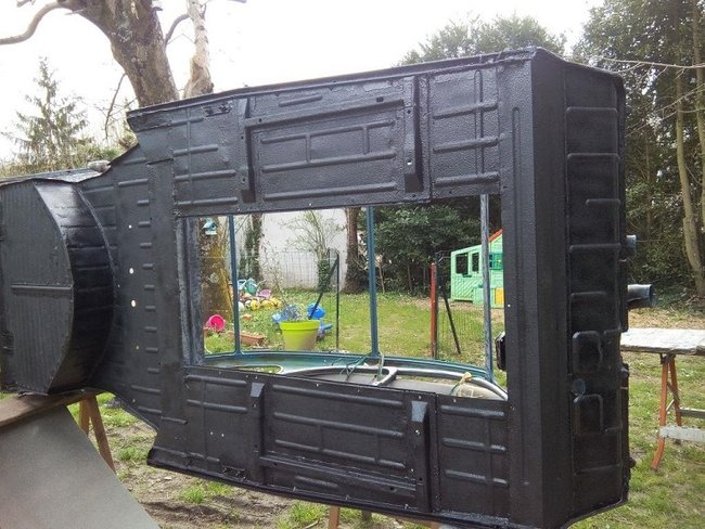 Il y a eu de la soudure, du décapage, du martelage,du masticage, du ponçage, du masticage, du ponçage [prendre les deux derniers mots et les répéter Ad Libitum] :D; de la peinture, de l'assemblage, de la sellerie (moquette au sol et sur les côté, isolant thermique et phonique dans les portières et réfection des panneaux de porte, fabrication d'un plancher de coffre et d'un panneau pour la porte de coffre) pose d'un allumage électronique, d'un lave-glace électrique ((en promo à 15 € sur un site web siégeant à Amboise), des diodes pour remplacer les voyants et les ampoules veilleuses et stop : les codes/phares sont en H4.