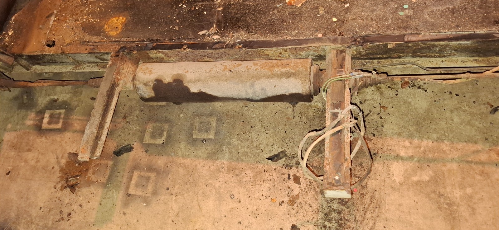 Le plancher et longerons sont carrément bouffés par la rouille... elle avait déjà subi avant 2002 un rajout de tôle que l'on voit bien niveau pédalier et une partie du plancher passager et conducteur...