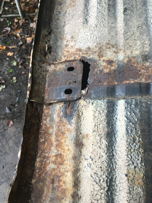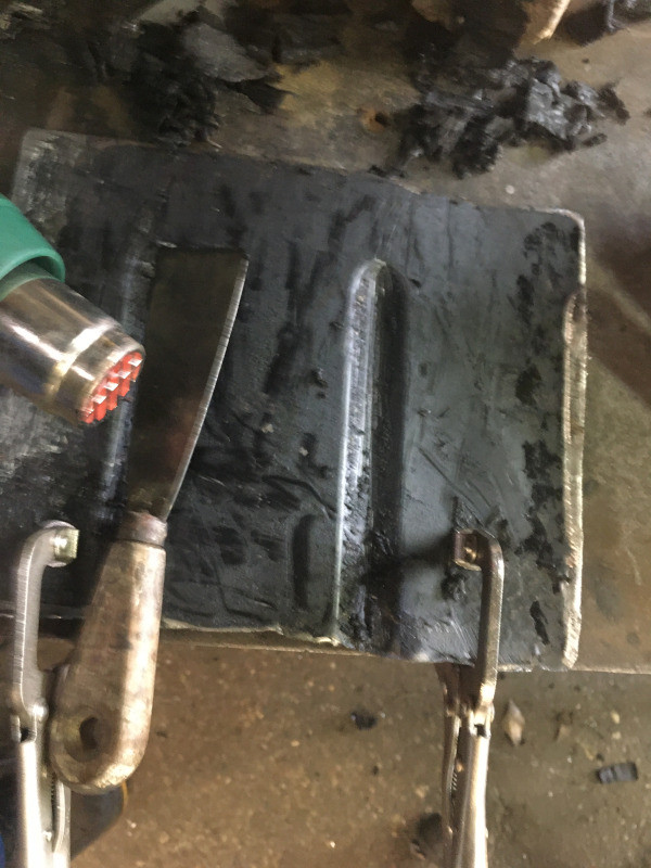 La tôle au départ : Grattage de l'enduit caoutchouc, facile avec une spatule et à l'aide du décapeur thermique : Remarquez le bon état de conservation de la tôle, sous l'enduit :