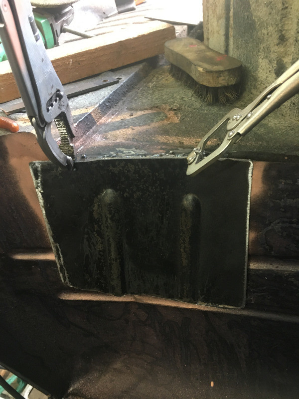 Il m'a fallu meuler de nouveau, remarquant, au passage, que la tôle a gardé sa couleur "rouille", une fois l'enduit ôté, pour pouvoir souder mes deux petits carrés.