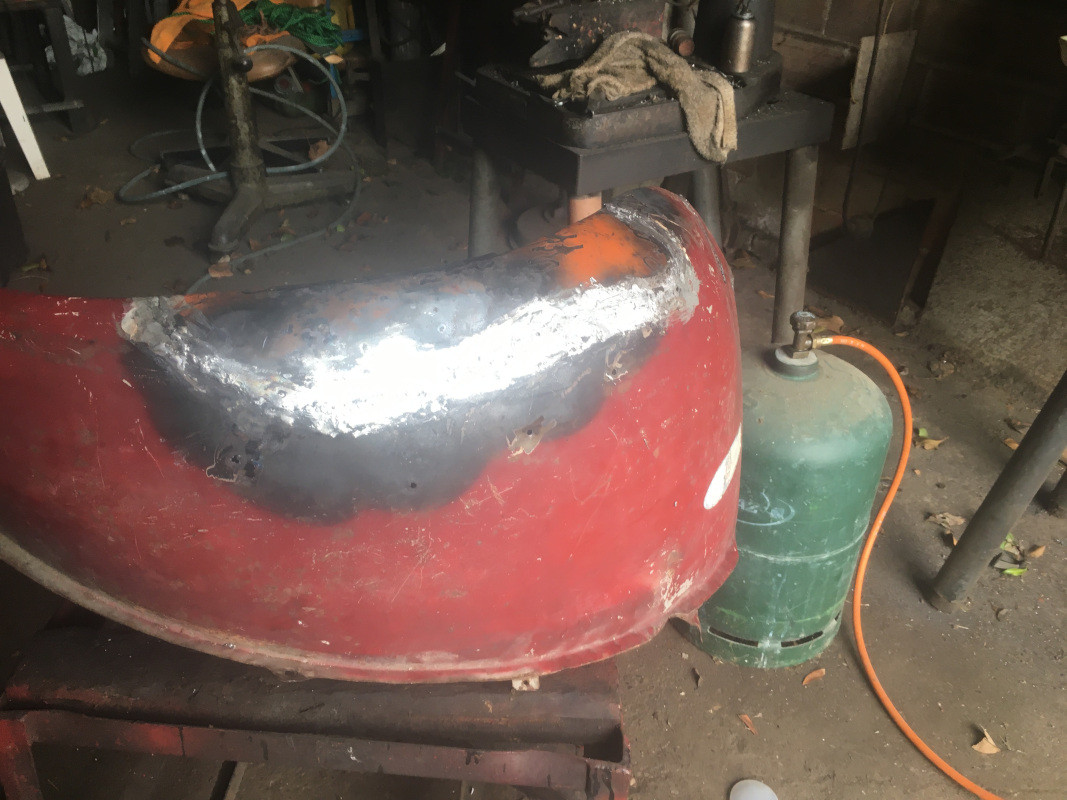 Après réflexion, je pense que je vais meuler toutes ces horreurs (la tôle de réparation ne jouxte pas bien les bords découpés de l'aile) et je ferai les finitions à l'étain.