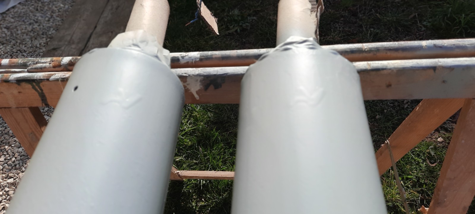 Voilà les pots de suspension apprêtés et peints, j'ai dû reboucher des petits trous sur le cylindre avec du mastic métal car de l'huile s'en échappait. Tous les filets ont été nettoyés