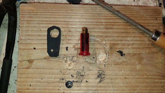 2ème étape : avec un chasse goupille, faire sortir les deux broches aux extrêmes qui sont rentrées en force. Cela permet d'enlever le capot posterieur. 3ème Étape : adapter à chacune des broches un fil de quelques centimètres. Réengager les broches dans leur emplacement initial. Et remettre le capot 4ème étape : préparer une "pâte" pour la fixation du voyant. Ici une languette de plastique noir rigide. 5ème étape : remonter le commodo. Adapter la "pâte" grâce à l'écrou de la tige. Y insérer le voyant et faire les branchements. 6eme étape : repositionner le commodo dans l'habitacle Rebrancher les cosses derrière le bac à batterie.