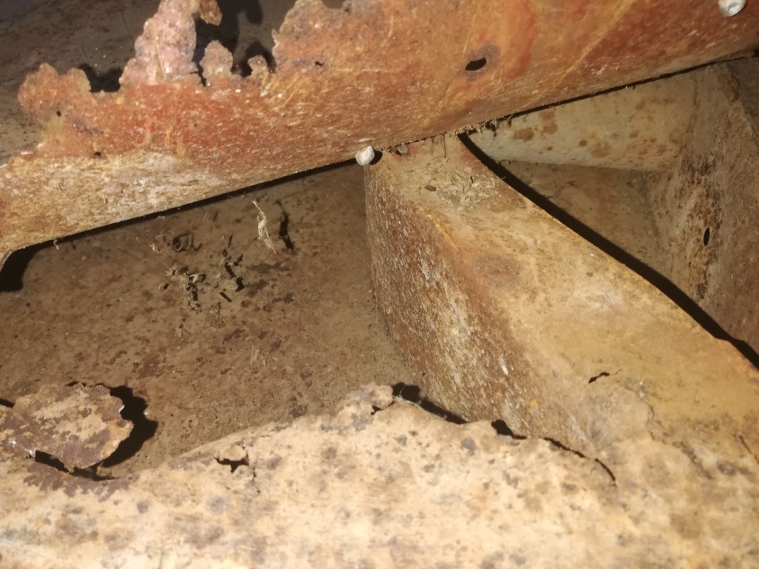 Mon diagnostic se confirme. Après avoir retirer la tôle du dessus j'ai trouvé trois kilos de terre + nid de souris : Mais la structure est relativement saine, je n'ai qu'un trou sur la dessus : et un trou dans le bas : Voilà ce n'est pas grand chose, le reste est rouillé mais légèrement en surface : donc je garde ce châssis ( important si je décide un jour de passer en carte grise de collection)...