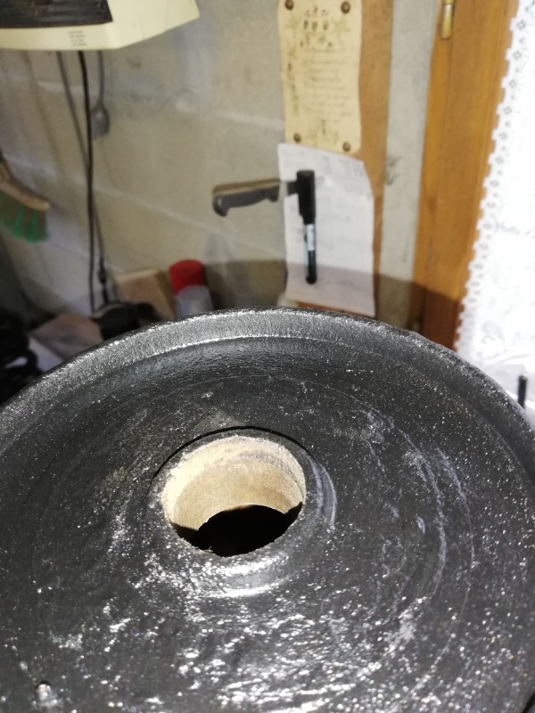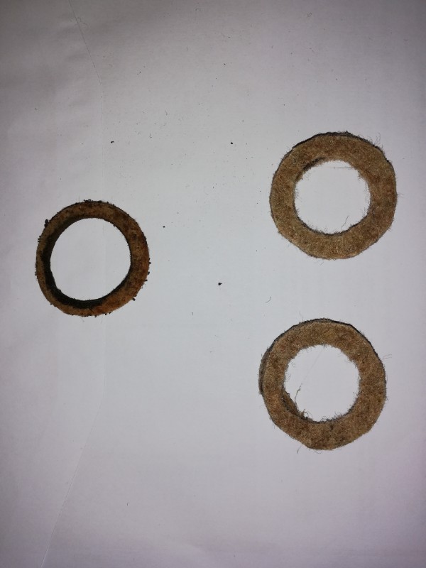 Il devait mesurer à l'origine 40 mm de diamètre extérieur et 26 mm intérieur. En fouillant dans mon bazar, j''ai trouvé un bout de tapis qui ressemble fort à la matière d'origine, le seul problème c'est que le joint d'origine mesure 5 mm d'épaisseur environ alors que mon bout de tapis ne fait que 3 mm..J'ai donc choisi de doubler . Après m'être servi de deux douilles, une de 40 mm et l'autre de 26 mm pour faire les cercles extérieurs et intérieurs, j'ai découpé mes joints, les aie collés par paire et voici ce que ça me donne :