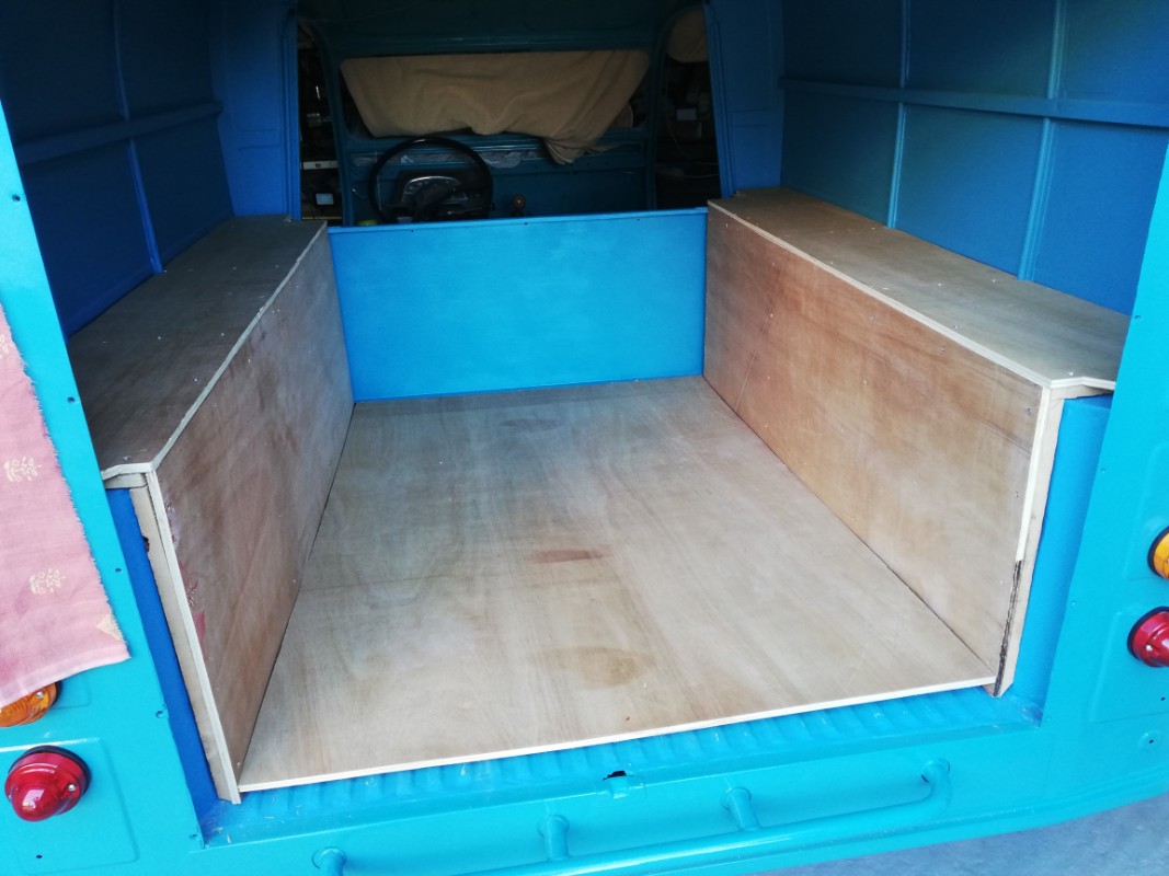J'attends le retour de mes pièces qui sont à la peinture, et notamment le volet d'air...En attendant je me suis attaqué à l'habillage intérieur de la caisse arrière que je fais en contreplaqué de 10 mm...c'est un travail agréable car j'adore travailler avec le bois ! Après en avoir bavé avec la préparation avant peinture.