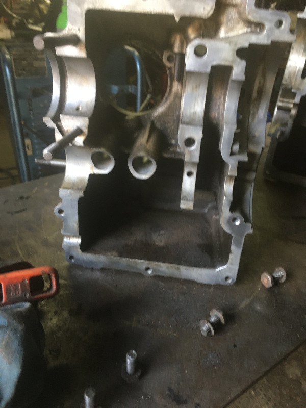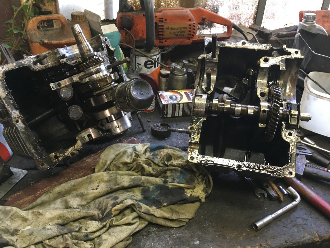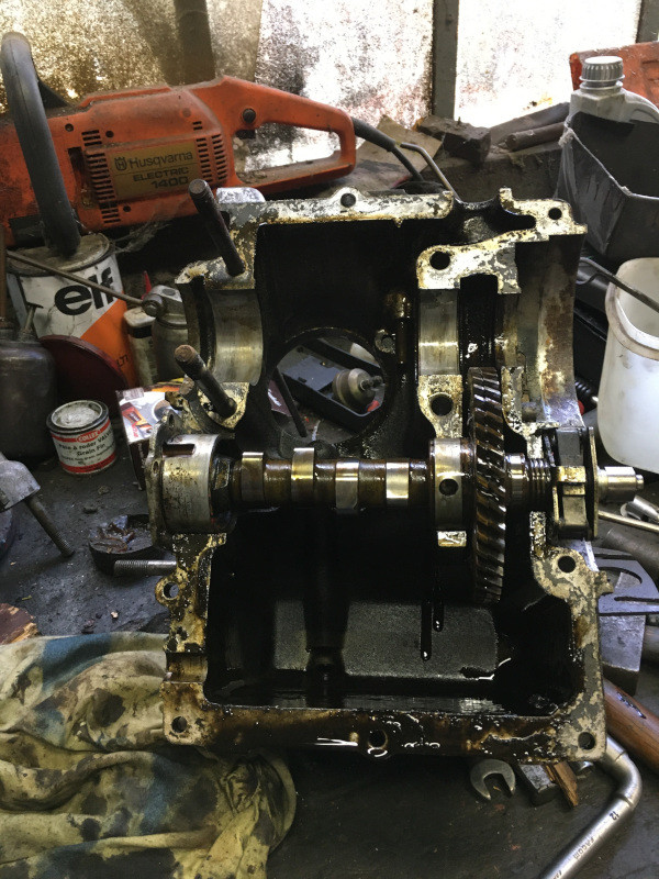 Aujourd'hui, je me suis attaqué au moteur : ouverture des carters, dépose de l'arbre à cames et du vilebrequin, avec la pompe à huile.