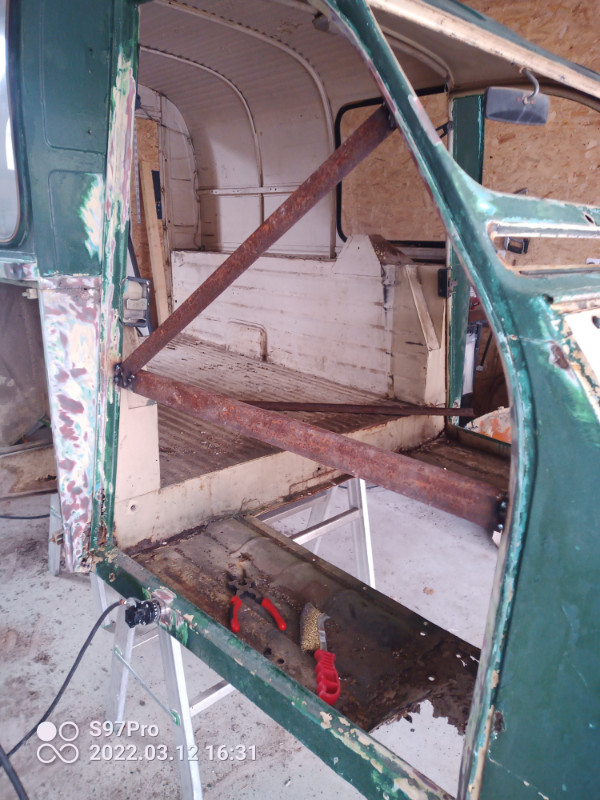 Je comptais bien découper un peu plus de tôle pour inspecter les entrailles du châssis et en profiter pour pulvériser dela cire ou du Férose.