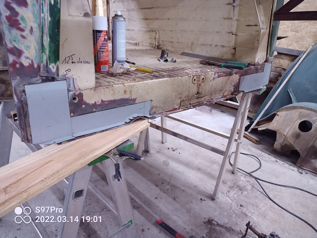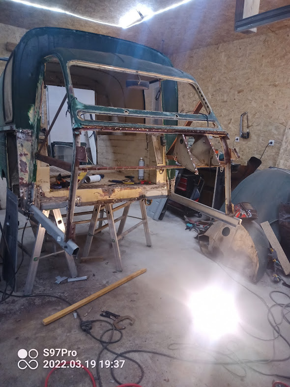 Bien, te voilà engagé dans la même galère que j'ai été...avec en plus le tablier , ça va être beau comme un sou neuf ! Mais je vois que tu n'as pas soudé une barre en travers ? je te conseille d'en mettre une pour éviter que la caisse bouge en largeur...surtout après avoir sorti le tablier...