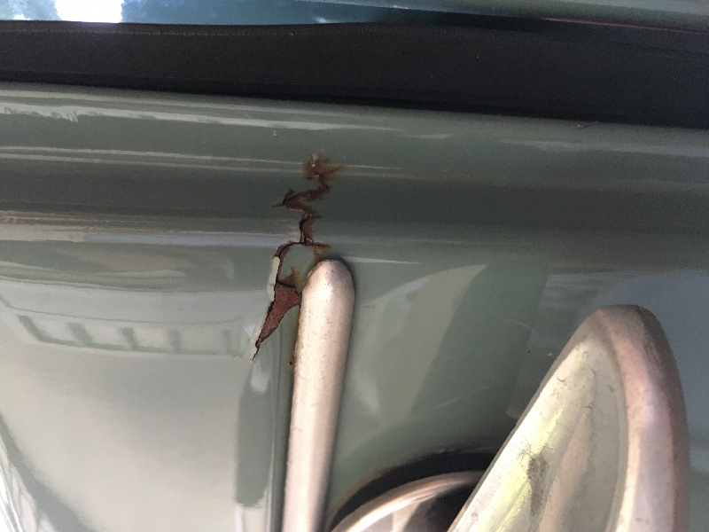 Au sujet de la porte, ça m'embête un peu car la tôle au niveau de la poignée a légèrement plié et la rouille s'est mise dedans entrainant l'écaillage de la peinture sur 5 cm depuis l'arrête de porte.