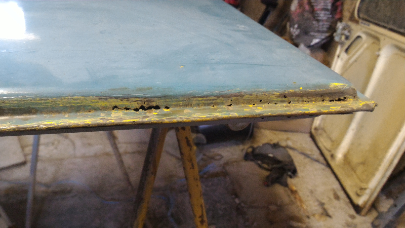 Pour les portes gruyère quand c'est pas trop grave je rebouche les trous de rouille au semi auto, mais quand c'est trop grave je fait comme sur la photo j'ai découper les coin de ma porte avec une petite disqueuse et j'ai couper au mesures une tôle, que j'ai ensuite former, puis j'ai souder points par points au semi auto c'est la qui fo prendre sont temps je soudais 1 point à gauche et 1 à droite et j'allais fair autre chose, attendre bien 5 à 10 mn que sa refroidisse parsque si la soudure surchauffe sa va déformer toute la porte et c'est foutu sachant que normalement la forme d'un panneaux de porte de deuch est ultra plat il fo faire attention, un fois souder meuler en fesant tourner la meule lentement pour pas trop chauffé, ensuite lisser le tout au mastic.