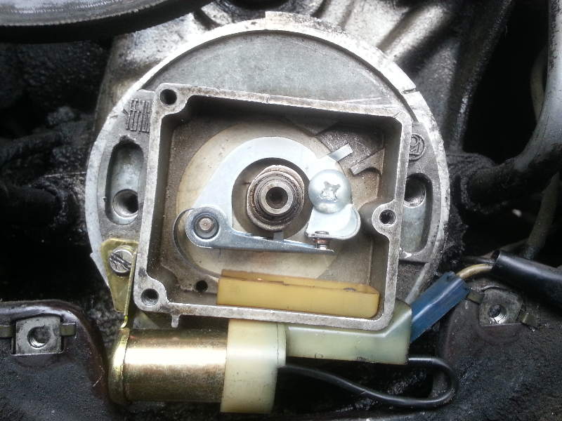 1) débrancher la cosse bleue d'alimentation de la bobine, mesurer 12 V (ou plus) entre le + de la batterie et la fiche bleue (lorsque le rupteur ferme de circuit, lorsque le rupteur ouvre le circuit la mesure est de 0 V, faire tourner manuellement le moteur pour ouvrir ou fermer les vis. Ceci permet de tester les vis platinées