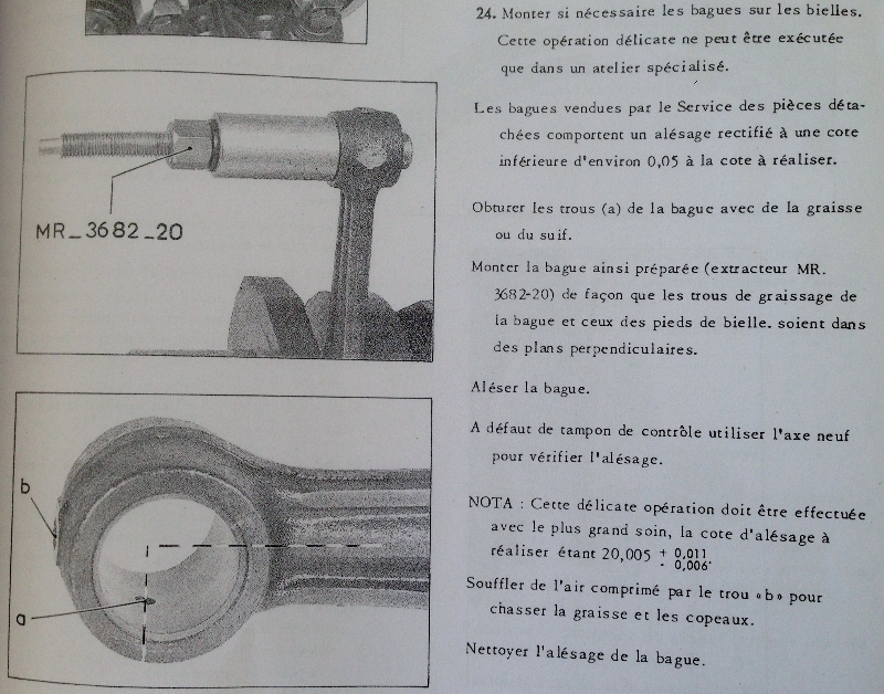 "Monter la bague en faisant coïncider les trous de graissage de la bielle et de la bague (utiliser l'extracteur MR-3681, voir planche 14 fig. 2 et 4).