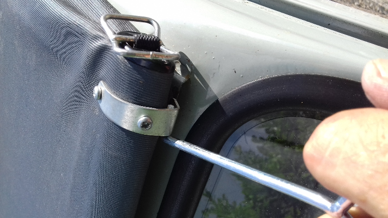Enfin, pour éviter de nouveau ce désagrément, j'utilise dorénavant un outil très pratique pour tirer les crochets de la barre de la bâche et le sortir ou rentrer dans les pattes du haut de la baie, il s'agit tout bêtement d'une clef utilisé pour tirer les ressorts de trampoline (Décathlon) ! de petit diamètre, le bout retourné se glisse sans forcer entre le crochet et la patte, et il suffit de tirer et positionner en face de la patte, puis relâcher en poussant dans l'axe. Ainsi, je ne sollicite plus du tout les perfides sangles, à part pour crocheter la bâche enroulée en mode cabrio !