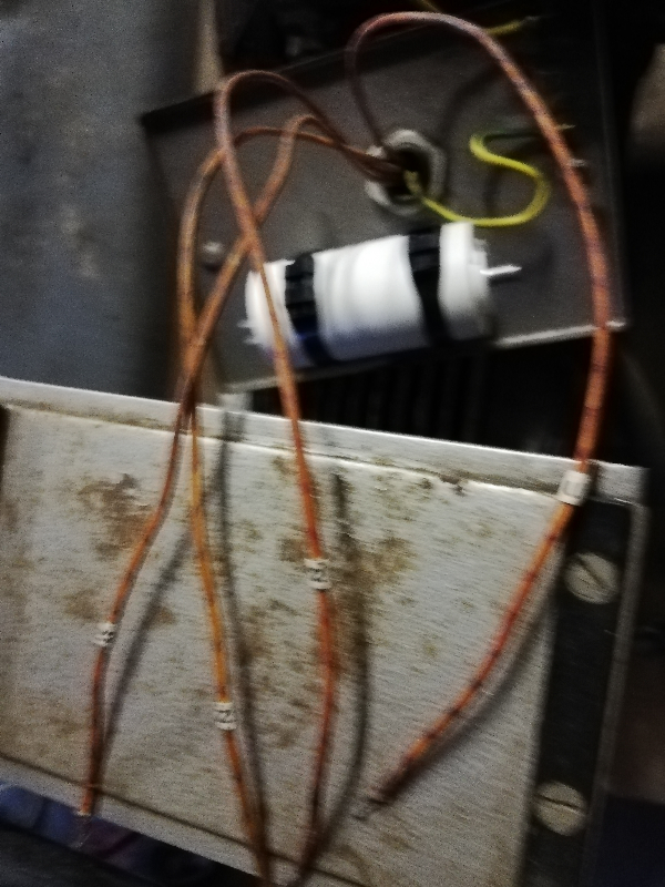 Je te mets cette photo aussi car on aperçoit l'autre côté des anciens condensateurs munis de leur goujon? Ce qui est sûr c'est qu'ils étaient maintenus par des colliers de serrage en acier pour la mise à la terre du boitier.