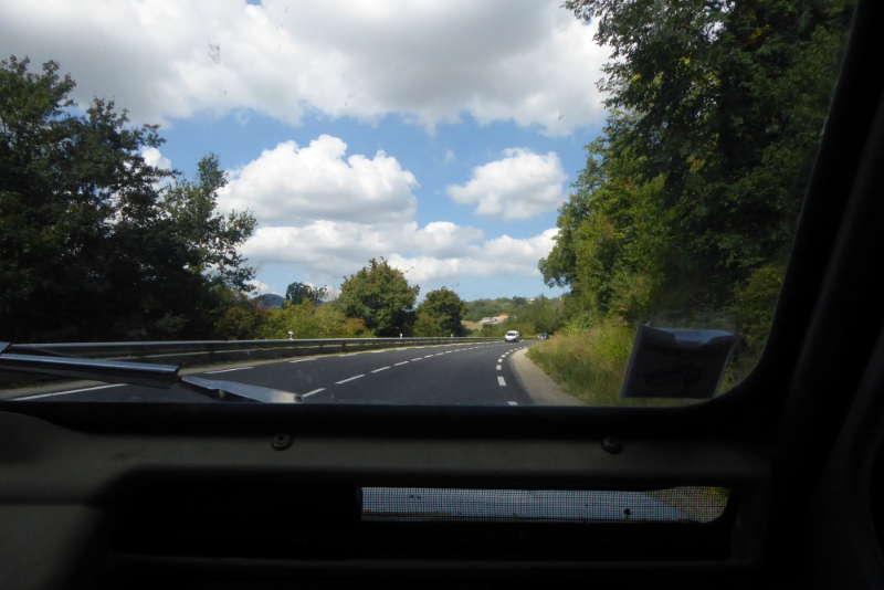On est sur la route ! On est partis hier de salon de Provence, avec un membre d'équipage en plus, qu'on larguera le soir dans les monts du Lyonnais. Direction Orange pour récupérer un sac de couchage (les nuits sont fraîches quand même), puis remontée dans la vallée du Rhône jusqu'à Valence pour la pause casse croûte. Ensuite on monte encore dans la vallée du Rhône jusqu'à St chamond, et c'est parti pour l'étape de montagne ! On grimpe sans arrêt, la dernière montée passe en première, et nous voilà arrivés là où nous allons passer la nuit, dans un château surplombant les vallées, une vue magnifique ! Au petit matin (11h) on repart, on redescend ce qu'on a monté la veille puis on rejoint la N7 et en ce moment même, on casse la croûte à Roanne