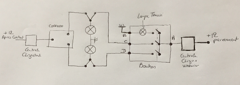 quand j'avais remonté la deuche j'avais beaucoup peiné sur ce feux de détresse et j'avais fait un schéma qui ressemble fort au tien. Donc je vais m'y tenir et y aller fiche par fiche.