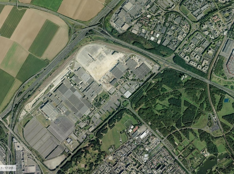 Voici une vue tirée de Géoportail. Le Conservatoire est le bâtiment blanc au milieu de la photo près du rond point. Je ne sais pas quand cette photo satellite a été prise, mais on voit qu'une partie de l'usine, en haut à gauche, est déjà détruite.
