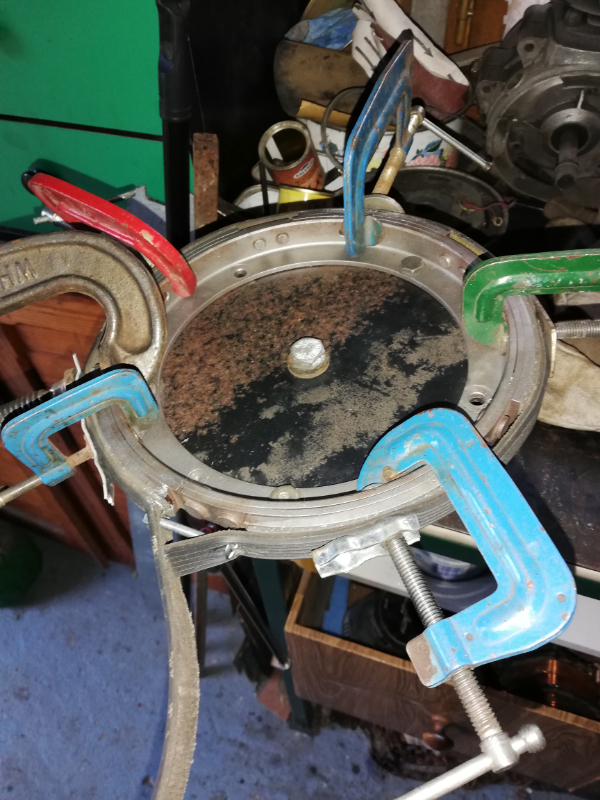 Ça va rester ainsi quelques mois , les pattes finiront par se repositionner un peu contre la circonférence de la couronne... Rassurez vous, les étaux pressent une vieille courroie de machine à laver ajustée sur les garnitures...