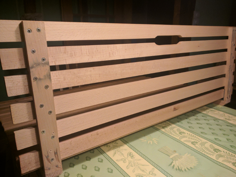 Note: Tu peux faire des lattes plus larges et plus épaisses en fonction du poids que tu dois transporter régulièrement. Renforcer le milieu par une troisième latte aussi. Aussi remplacer les équerres par des charnières, mais il faudra les fixer au dessus et elles seront visibles.