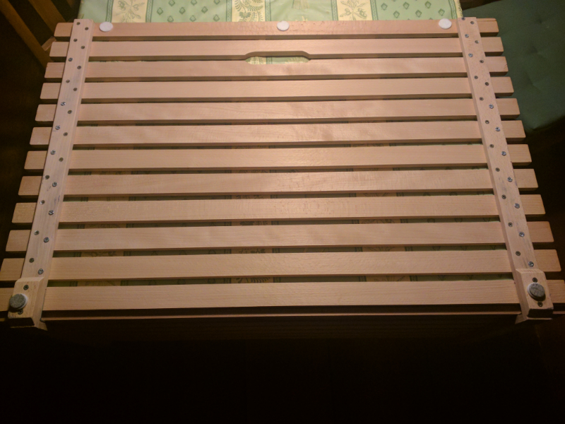 Note: Tu peux faire des lattes plus larges et plus épaisses en fonction du poids que tu dois transporter régulièrement. Renforcer le milieu par une troisième latte aussi. Aussi remplacer les équerres par des charnières, mais il faudra les fixer au dessus et elles seront visibles.