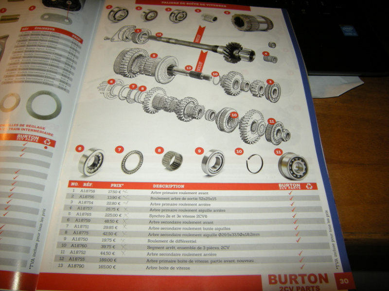 Ça y est , j'ai passé commande des roulements, cage à aiguilles, et rouleaux pour refaire la boite de vitesse...Il y a juste un roulement épaulé que je n'ai trouvé nulle part et qui ne figure pas sur l'éclaté de la boîte de vitesse , voir ci dessous le roulement surligné. Il comporte la même référence que le roulement épaulé sur l'arbre secondaire ne dessous, mais il n'a pas la même cote, il fait 12 mm d'épaisseur, alors que l'autre fait 19 mm , encore une inconnue Citröen :???: