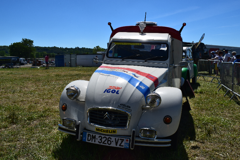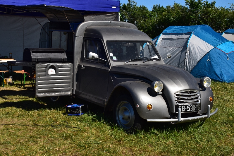 La 2 CV 6 bleue, deuxième à gauche du barnum rouge et blanc... :mdr: